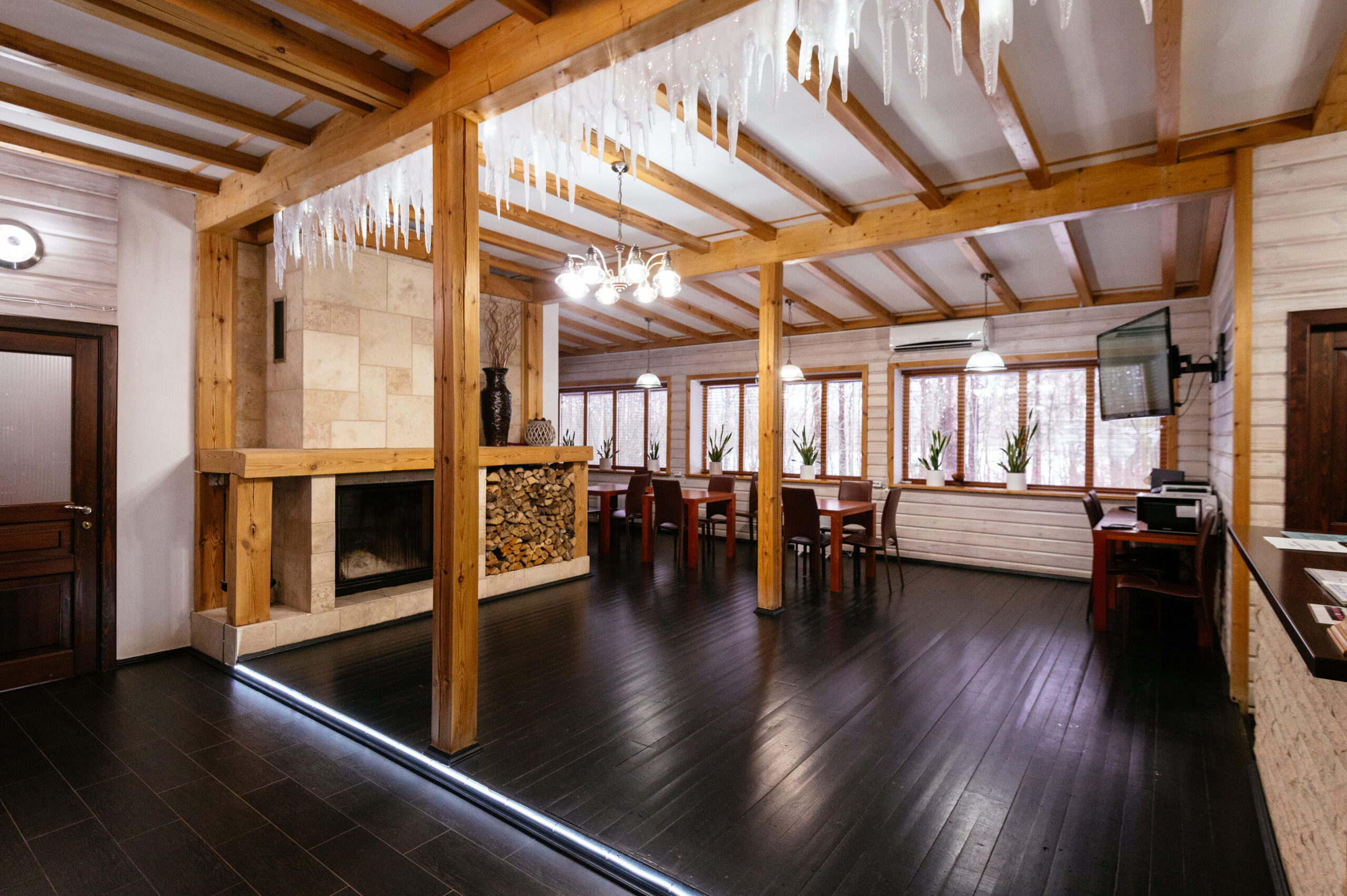 Столы, стулья, диваны, большой плазменный ТВ, DVD ,караоке, санузел, на прилегающей территории  рядом — уличная мебель и мангалы. Стоимость аренды зала – 3000 рублей/час, минимальная аренда 5 часов. Продукты  и одноразовая посуда – от клиента.